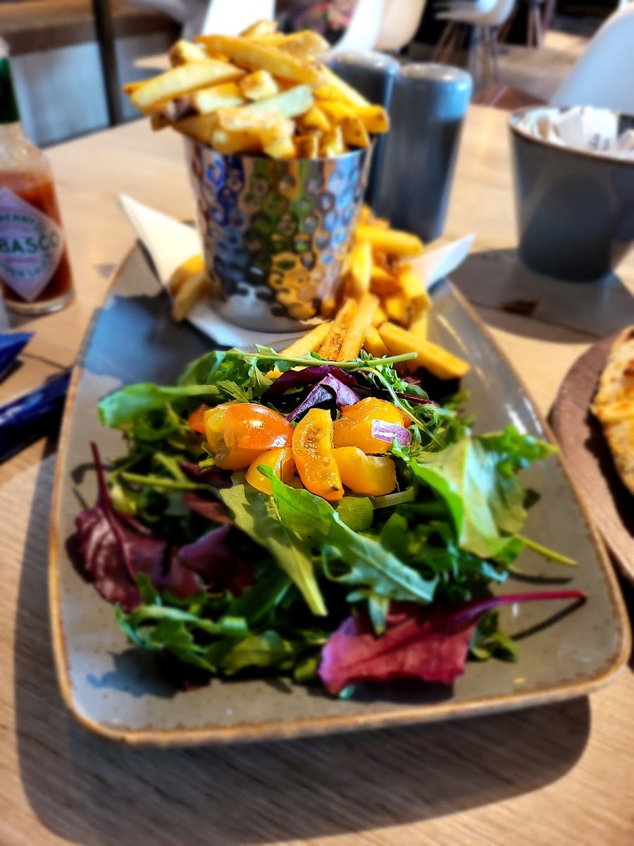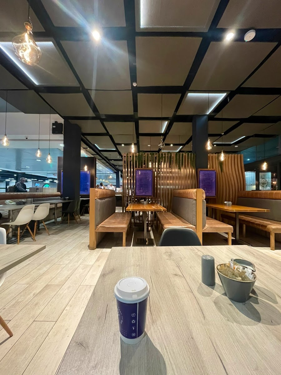 Lovely place for food after you've landed or before security when taking off. Also available if you're not flying if you are waiting to pick up someone. We came before dinner starts but we asked if we could order off the dinner menu and there was no question asked! I had a delicious pizza while my companion had a burger and chips! Very speedy service with a delicious taste of home before we took off. Highly recommended!